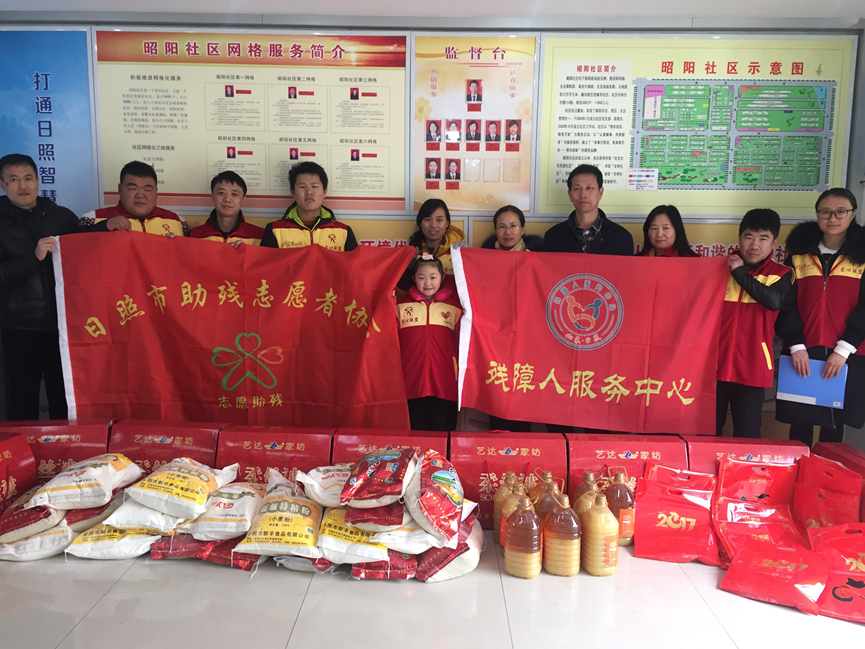 1月19日,在春节即将来临之际,日照市市助残志愿者协会携手市残障人服务中心,举办“残友情 阳光行”走进昭阳社区活动,组织部分助残志愿者走访慰问贫困残疾人家庭,为昭阳社区的10户贫困残疾人送去棉被、米、面、油、福字等暖心大礼包,让贫困残疾人深深感受到志愿助残服务组织带来的关爱与温暖。市助残志愿者协会会长闫娜同志、副会长丁国栋同志,市残障人服务中心的助残志愿者们参加了走访慰问残疾人活动。