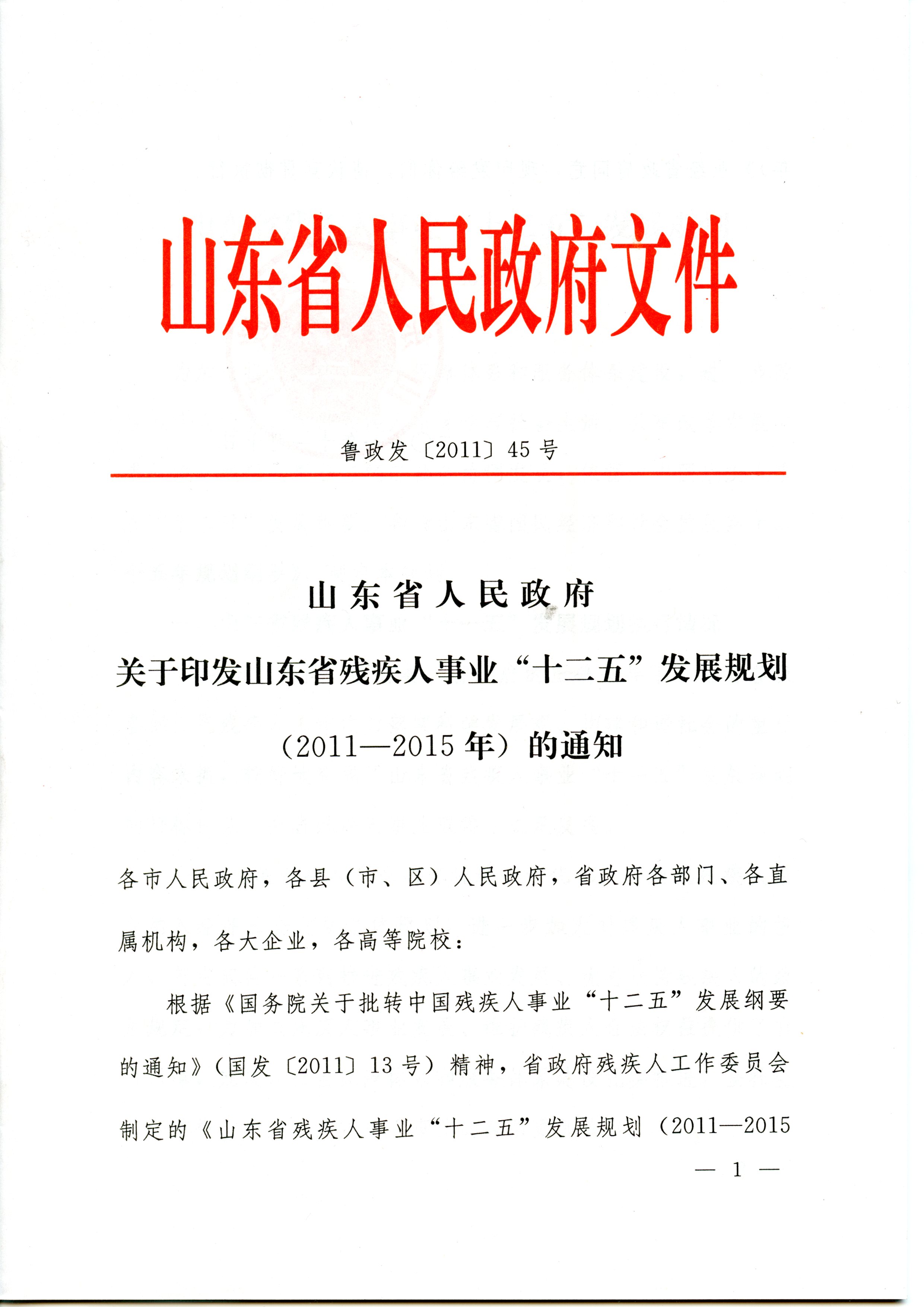 根据《国务院关于批转中国残疾人事业“十二五”发展纲要的通知》(国发【2011】13号)精神,省政府残疾人工作委员会制定的《山东省残疾人事业“十二五”发展规划(2011-2015年)》业经省政府同意,现印发给你们,请认真贯彻执行。
