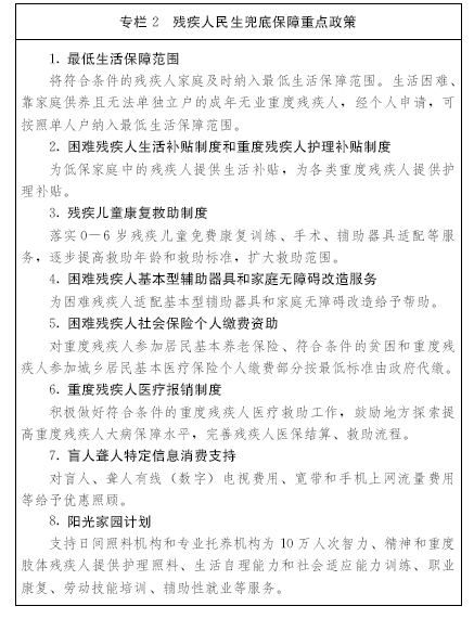 1.加大残疾人社会救助力度。将符合条件的残疾人家庭及时纳入最低生活保障范围。生活困难、靠家庭供养且无法单独立户的成年无业重度残疾人,经个人申请,可按照单人户纳入最低生活保障范围。对以老养残、一户多残等特殊困难家庭中因抚养(扶养、赡养)人生活困难、事实无力供养的残疾人,符合特困人员救助供养有关规定的,纳入救助供养范围并逐步改善供养条件。对纳入城乡医疗救助范围的残疾人,稳步提高救助水平。加强严重精神障碍患者救治救助工作,建立严重精神障碍患者防治管理和康复服务机制。对精神障碍患者通过基本医疗保险、大病保险支付医疗费用后仍有困难,或者不能通过基本医疗保险、大病保险支付医疗费用的,应当优先给予医疗救助或临时救助。社会救助经办机构对于残疾人申请社会救助的,应当及时受理并提供相应便利条件。对生活无着的流浪、乞讨残疾人给予及时救助;健全流浪、乞讨残疾人返乡保障制度,对因无法查明身份信息而长期滞留的流浪、乞讨残疾人给予妥善照料安置。将符合条件的残疾人纳入惠民殡葬政策范围。加快残疾人各项补贴政策统筹整合,逐步建立以残疾等级为标准的补贴制度。