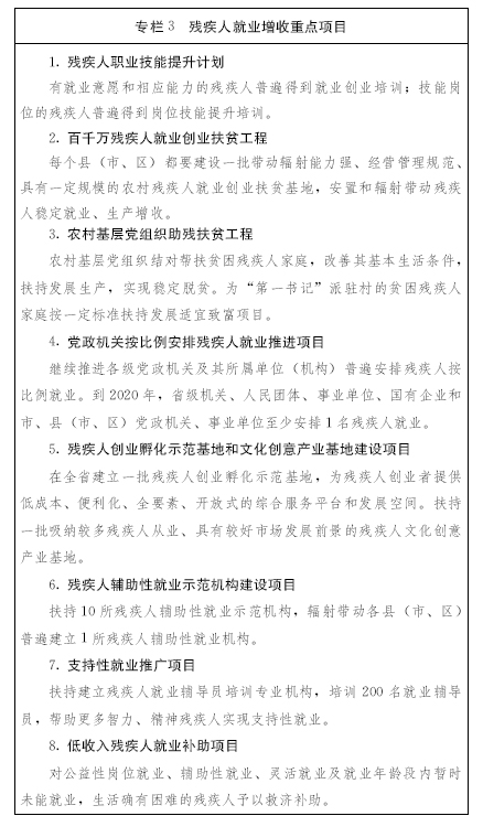 1.加大农村残疾人扶贫开发力度。把农村贫困残疾人作为重点扶持对象全部纳入精准扶贫工作机制和贫困监测体系,将农村贫困残疾人生活水平提高和数量减少纳入脱贫攻坚考核指标,强化分类施策和精准帮扶,政策、项目向贫困残疾人倾斜,确保农村贫困残疾人在2018年如期脱贫。实施“百千万残疾人就业创业扶贫工程”,充分发挥农民专业合作社、农业产业化示范基地、龙头企业和残疾人扶贫基地的辐射带动作用,加强实用技术培训、社会化服务和金融信贷支持,确保有劳动能力的农村残疾人家庭至少参与1项养殖、种植、设施农业等增收项目。有序组织农村残疾人转移就业。在资产收益扶贫工作中,财政专项资金形成的资产可折股优先配置给贫困残疾人家庭。积极引导贫困残疾人家庭采取土地托管或林权、农村土地承包经营权入股和土地流转等方式,实现家庭资产增值增收。大力实施“第一书记”帮包村助残扶贫项目、基层党组织助残扶贫工程,依托“农村电商”“光伏扶贫”“农家书屋”等项目搭建政府、社会力量共同参与的残疾人扶贫开发平台。实施“千牵万·残疾人互联网+就业创业扶贫行动”,每年培养1000名残疾人电商扶贫带头人,广泛带动农村贫困残疾人就业脱贫。