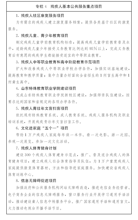 6.繁荣发展残疾人文化体育。将残疾人作为公共文化体育服务的重点人群,公共文化惠民工程、全民健身工程、全民阅读工程、公共文化体育服务机构和基层综合性文化服务中心要增加受残疾人欢迎的服务内容和活动项目,各类公共文化场所免费向残疾人开放,提供设施及信息交流无障碍服务。市、县(市、区)两级公共图书馆普遍设立盲人阅览室,定期增配、及时更新适合残疾人阅读的读物及阅读辅助设备。开展残疾人文化周、残疾人文化进社区、送电影进社会福利机构、残疾人文化建设示范社区培育活动。支持创作、出版残疾人文学艺术精品力作,培育残疾人文化艺术品牌。加大对残疾人文化创意产业的支持力度,引导和支持各类文化产业企业吸纳残疾人从事文化工作。培育建设一批残疾人文化从业创业示范基地。开展残疾人特殊艺术项目发掘保护,加强特殊艺术人才培养,扶持以特殊教育学校为主的残疾人特殊艺术人才培养基地。举办第九届全省残疾人艺术汇演和第八届全省特教学校学生艺术汇演,组织参加全国残疾人艺术汇演。成立山东省残疾人文学艺术界联合会,建立健全残疾人文化人才档案。开展残疾人文化艺术国际交流。