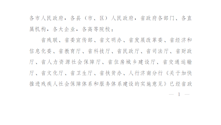 省残联、省委宣传部、省文明办、省发展改革委、省经济和信息化委、省教育厅、省科技厅、省民政厅、省司法厅、省财政厅、省人力资源社会保障厅、省住房城乡建设厅、省交通运输厅、省文化厅、省卫生厅、省扶贫办、人行济南分行《关于加快推进残疾人社会保障体系和服务体系建设的实施意见》已经省政府同意,现转发给你们,请结合实际,认真贯彻执行。