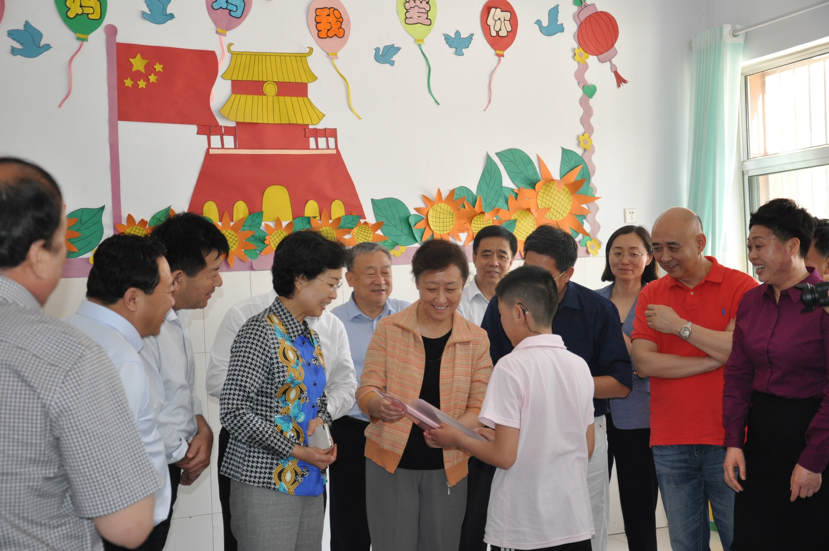 图为在夏津县特殊教育学院视察,翟鲁宁副主席详细了解人工耳蜗术后的聋生康复和学习情况