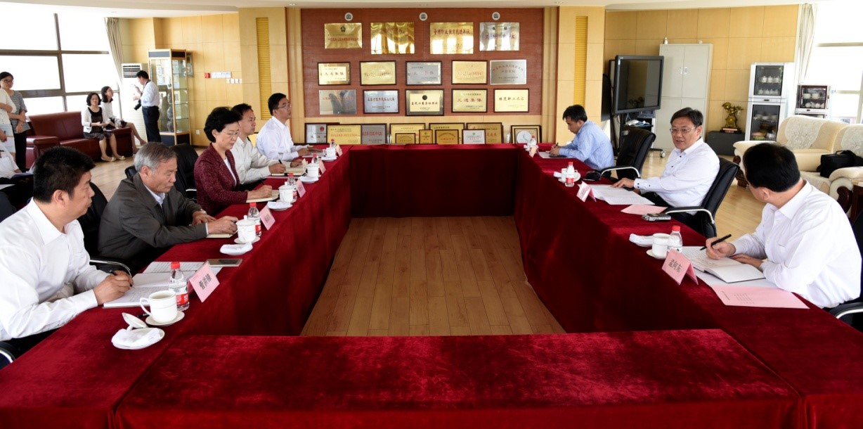 图为王文涛副书记听取省残联党组书记、理事长仉兴玉汇报残疾人工作