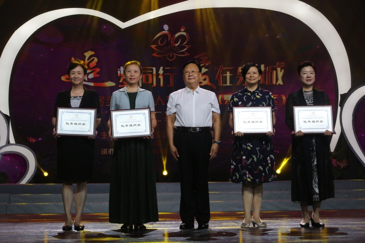 第九届全国残疾人艺术汇演(东部片区)组委会副主任、执委会主任、山东省残联党组书记、理事长仉兴玉向获得优秀表演奖的代表颁奖