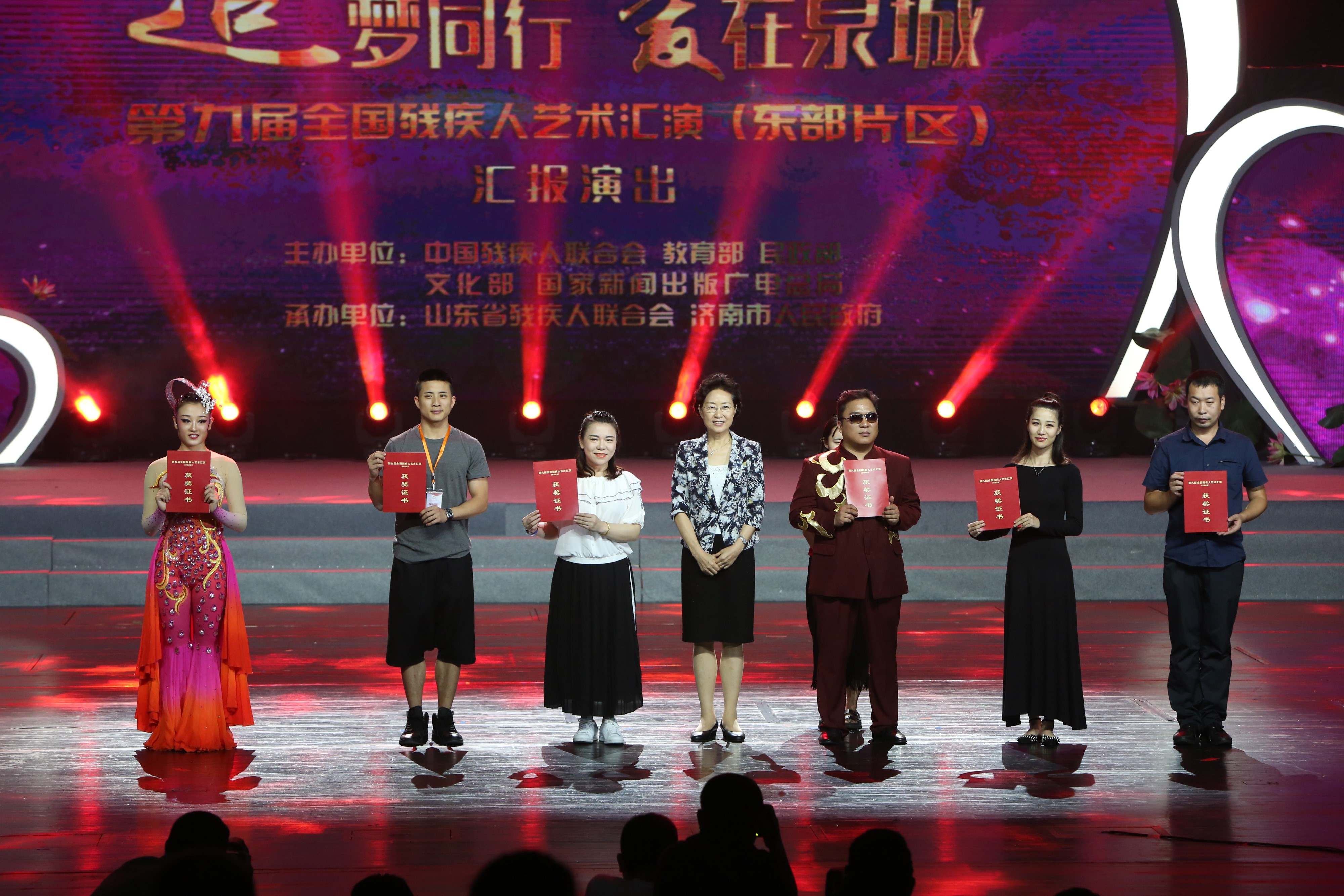 8月16日,第九届全国残疾人艺术汇演(东部片区)汇报演出在济南省会大剧院举行。第九届全国残疾人艺术汇演(东部片区)组委会主任、中国残联党组副书记、常务副理事长孙先德,山东省政协副主席陈光,组委会副主任、执委会主任、山东省残联党组书记、理事长仉兴玉,济南市副市长周云平出席活动并为获奖代表颁奖。组委会副主任、中国残联宣文部主任郭利群,组委会副主任、山东省政府副秘书长卢杰和山东省委宣传部、省教育厅、省公安厅、省民政厅、省财政厅、省文化厅、省新闻出版广电局等组委会成员单位以及省政府残工委成员单位的负责同志观看汇报演出。