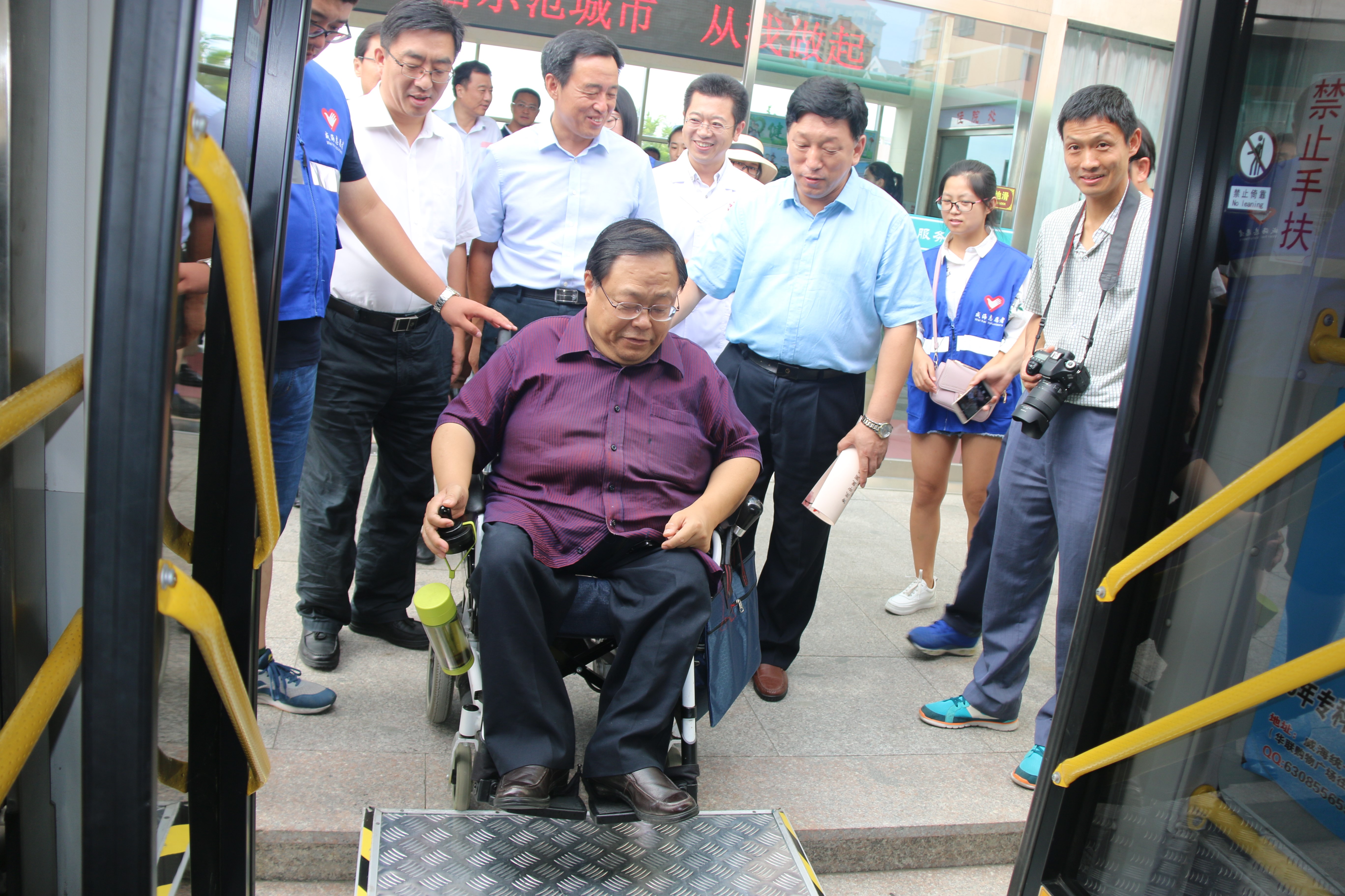 图为吕世明副主席在威海市孙家疃医院调研,乘坐无障碍公交车